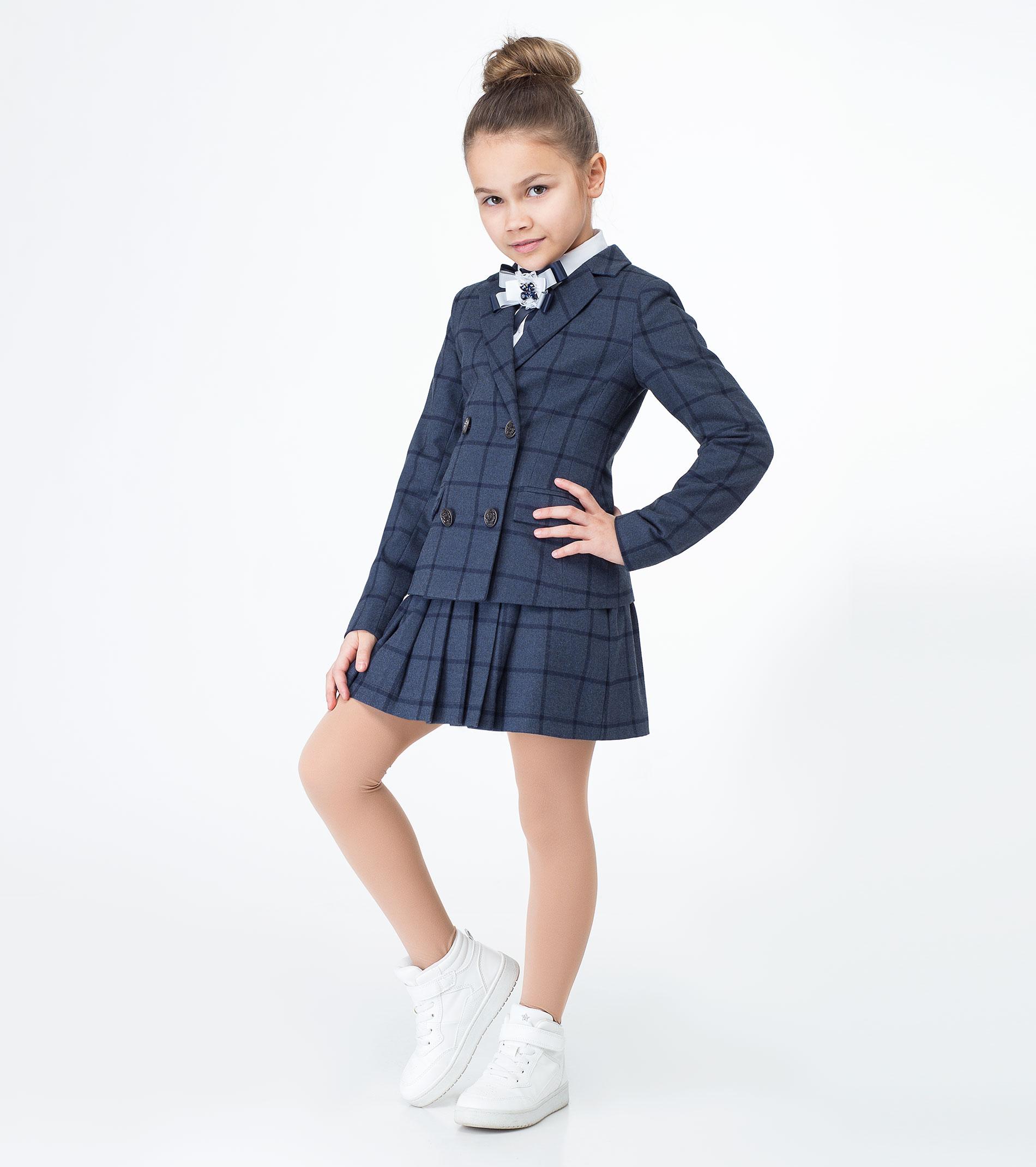 Стильный двубортный жакет для девочки из поливискозной ткани с рисунком в клетку. Жакет на поливискозной подкладки. Жакет полуприлегающего силуэта, с воротником, с V-образным вырезом горловины, со сквозной застежкой на петли и пуговицы. Рукава длинные. На жакете выполнены рельефы, обеспечивающие отличную посадку по фигуре. По переду имеются карманы с клапанами. Очень стильный модный жакет для модных школьниц.