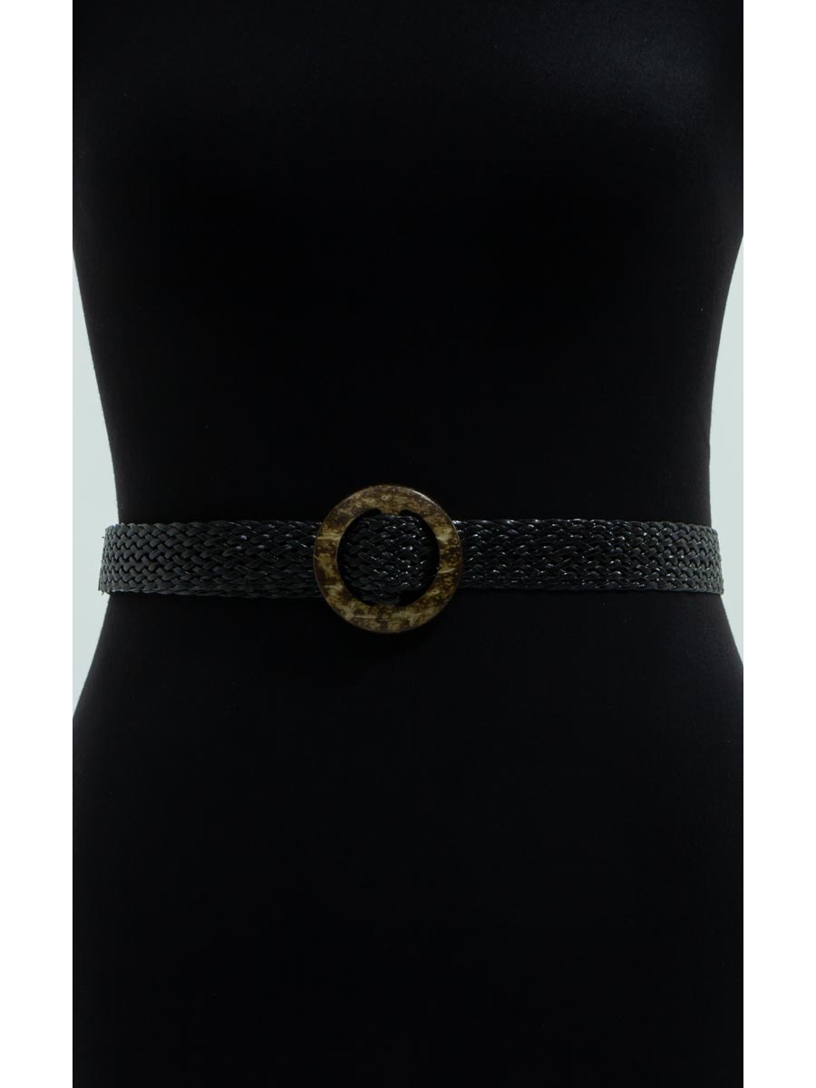 Ремень выполненный из искусственной кожи с пряжкой под дерево коричневого цвета.