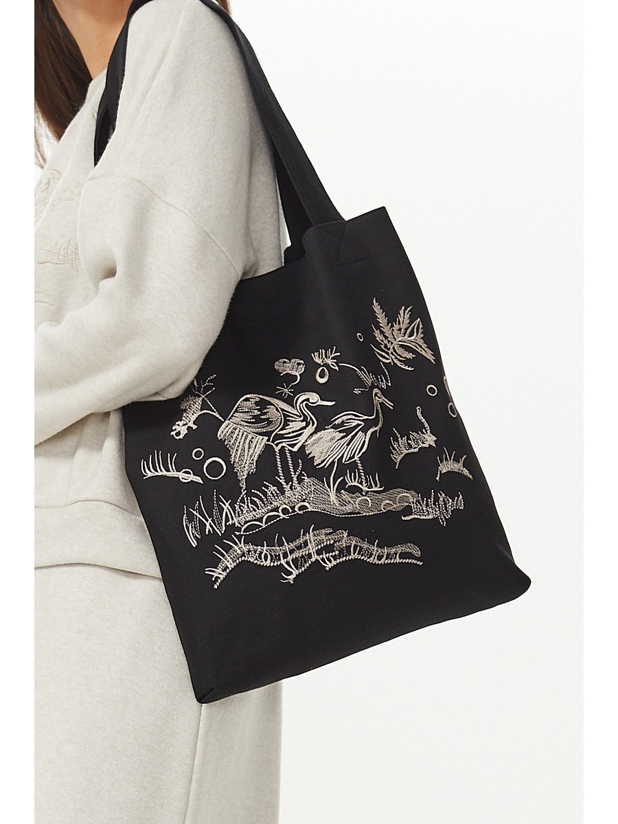 Шоппер прямоугольной формы с одним отделением. крепкие и и длинные ручки. Украшен декоративной дизайнерской вышивкой.
