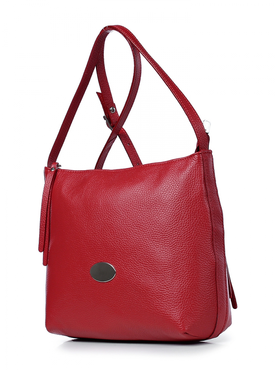 Сумка из натуральной кожи закрывается на застежку-молнию, с регулирующейся ручкой-ремнем, с украшением на передней стенке, с подвесным карманом на задней стенке, закрывающимся на застежку-молнию, с поводками на движках. Сумка на подкладке, с подвесным карманом закрывающимся на застежку-молнию, с открытым карманом.