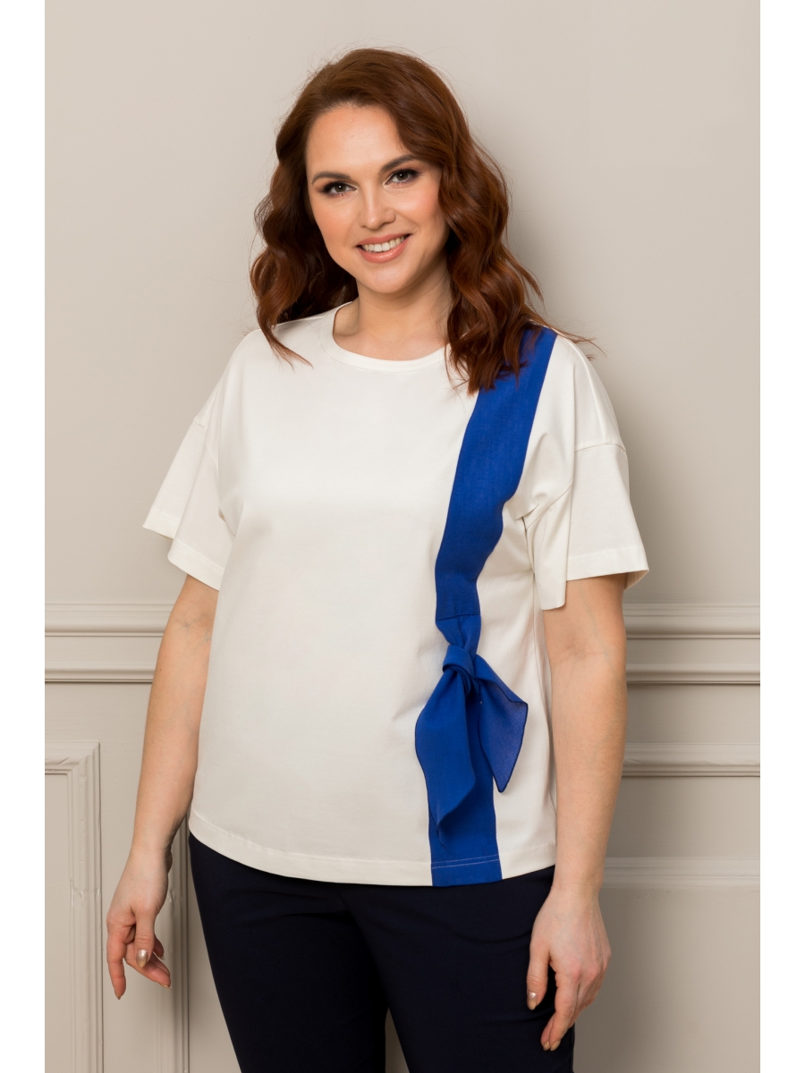 Блуза женская прямого силуэта. Горловина круглая, рукав втачной, короткий. На левую сторону переда вертикально настрочены две детали из тонкой х/б ткани синего цвета, завязывающиеся на бант. Горловина переда и спинки окантована.