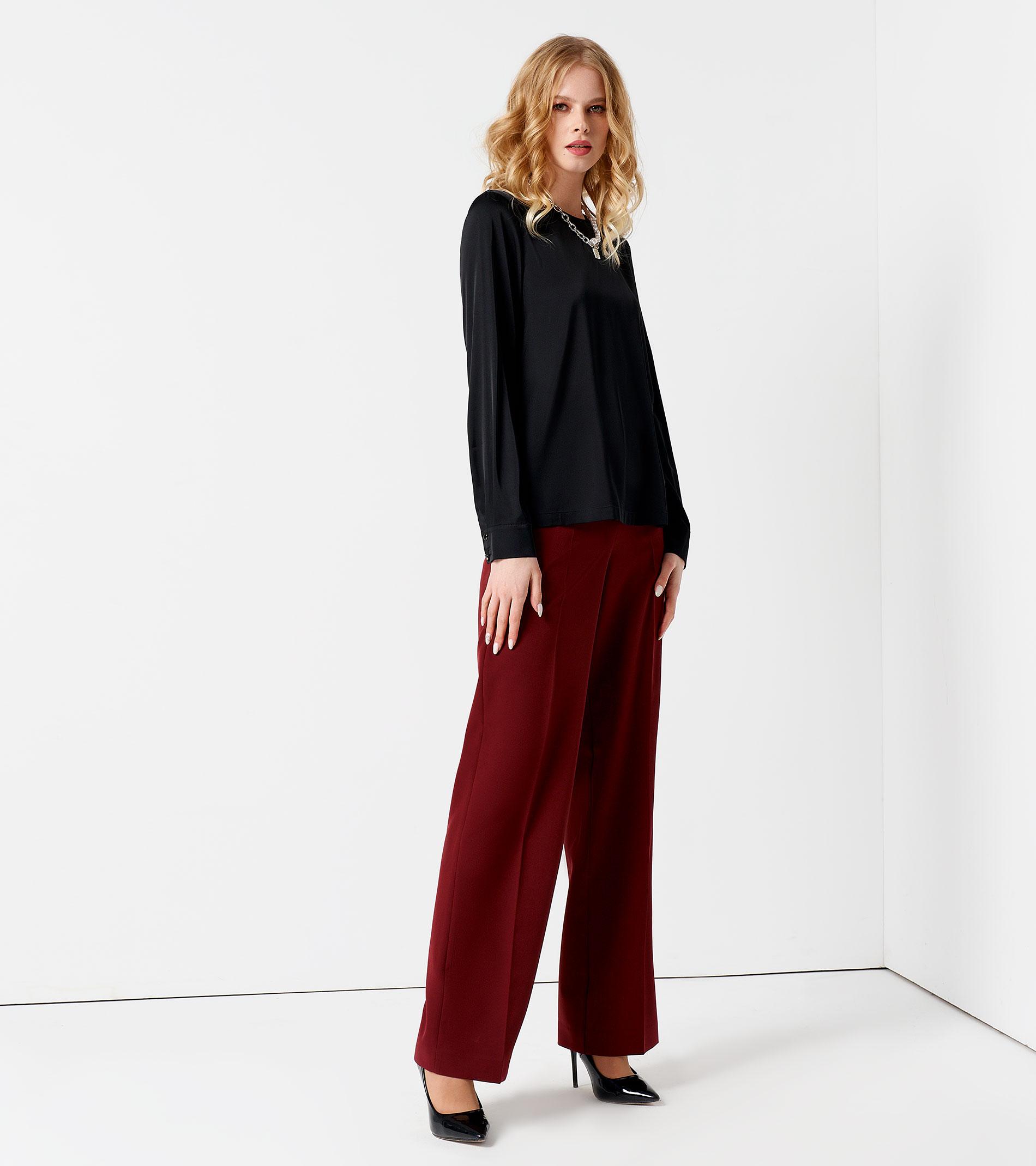 Лаконичная блузка из струящийся ткани с небольшим блеском. Блузка прямого силуэта с длинными рукавами с круглым вырезом горловины. Рукава с притачными по низу манжетами с декоративными пуговицами. Застежка по спинки на навесную петлю и пуговицу. По бокам разрезы. Отличный базовый вариант блузки в офис на каждый день.
