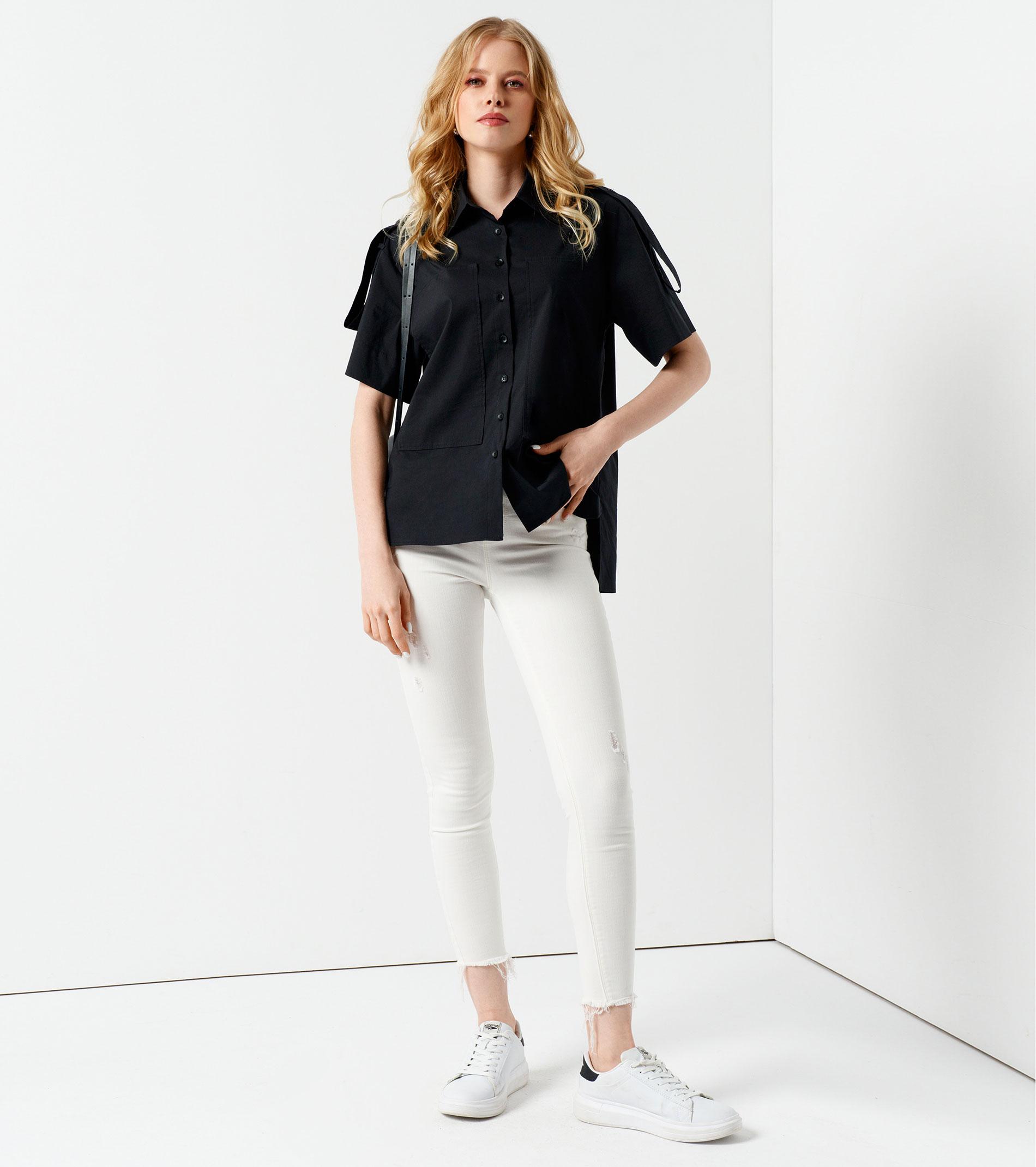 Стильная женская блуза с удлиненными нагрудными карманами станет отличной альтернативой классической рубашке в элегантных образах. Модель прямого кроя будет хорошо смотреться с классическими брюками, с прямыми и зауженными юбками, джинсами и шортами-бермудами. Блуза с коротким рукавом подойдет для офисного дресс-кода и для романтичных повседневных образов. Блуза женская будет отлично смотреться в многослойных сочетаниях с полувером или кардиганом и облегающими брюками скини. Белая блуза гармонично сочетает в себе элементы классического стиля и casual детали. Благодаря прямому крою и широким рукавам блузка рубашка свободно садится по фигуре и оставляет полную свободу движений. В этой стильной одежде вы будете чувствовать себя максимально комфортно даже в жаркую погоду. Нарядная женская блуза с классическим воротником будет хорошо смотреться на любой фигуре. Заказать ее можно для создания образов для офиса, посещения учебного заведения, семинаров, деловых встреч или фотосессий