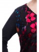 Нарядный джемпер прямого силуэта из трикотажного полотна черного цвета с узором. Вырез горловины изделия V-образный. Спинка выполнена из однотонного трикотажного полотна.