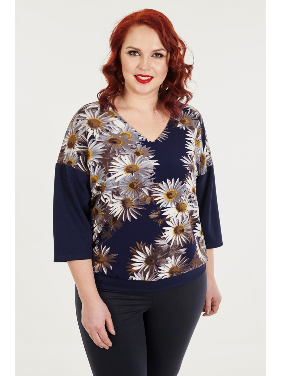 Яркий джемпер полуприлегающего силуэта из трикотажного полотна синего цвета с цветочным принтом. V-образный вырез изделия обработан внутренней обтачкой. Джемпер со спущенной проймой и втачными рукавами. По низу изделия выполнен манжет. Длина изделия по спинке от плечевого шва до низа изделия - 65 см. Рост фотомодели — 170 см.