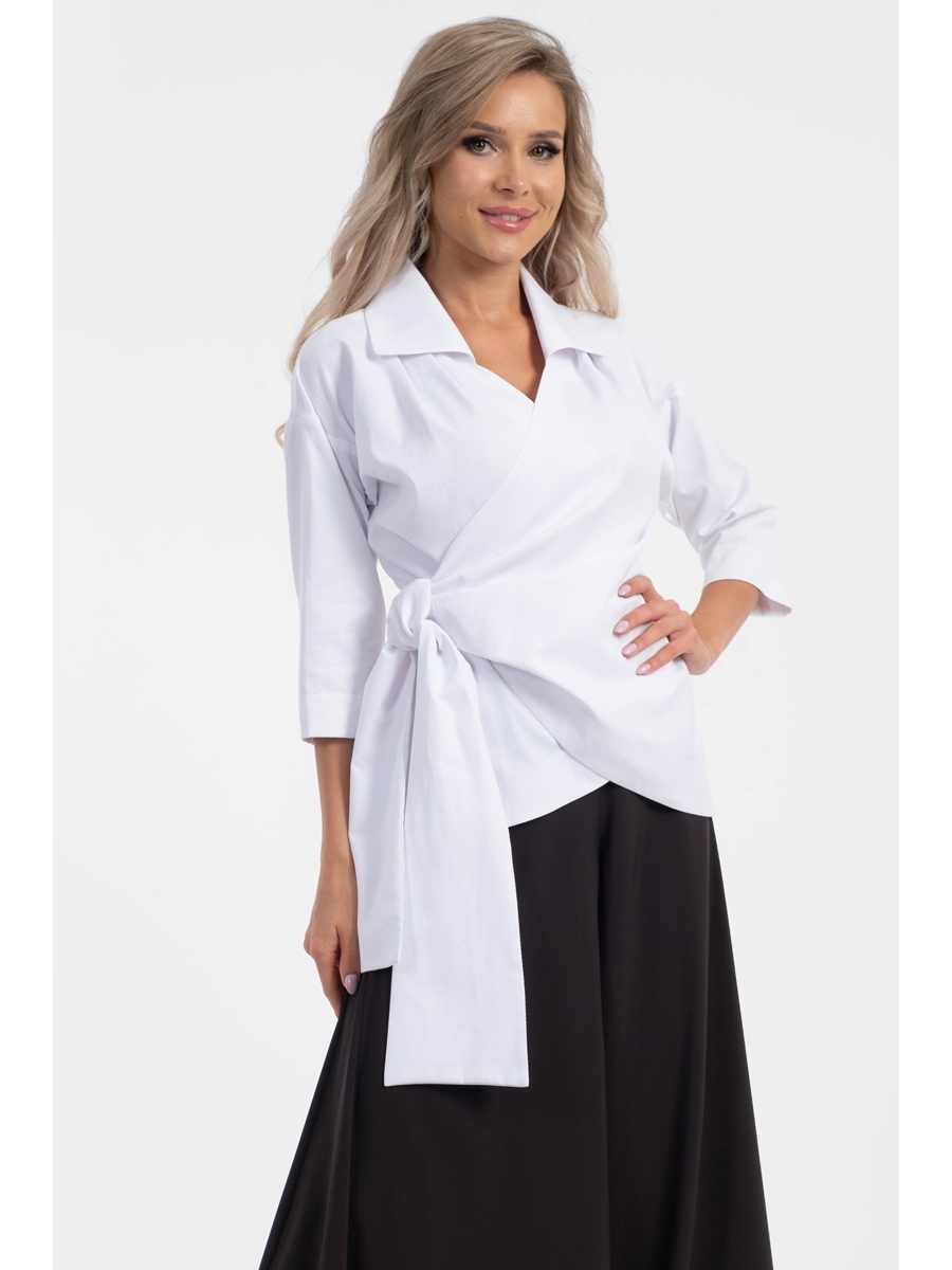 Стильная белая блузка полуприлегающего силуэта из текстильного полотна. Блузка с отложным воротником. По перереду изделия выполнен запах с широкими завязками. Блузка со спущеной проймой. Втачные рукава обработаны манжетами. Длина изделия по спинке от плечевого шва до низа изделия — 61 см. Рост фотомодели — 170 см.