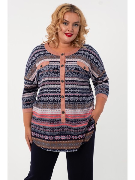Яркий джемпер-рубашка свободного силуэта из трикотажного полотна сине-розового цвета. Актуальное сочетание цветного трикотажа и розовой эко-замши создает запоминающийся образ. Круглый вырез изделия и втачные рукава со спущенной линией проймы обработаны внешней обтачкой. По переду изделия — планка с застежкой на пуговицы. В боковых швах блузы разрезы.