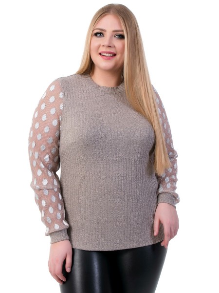 Эффектный джемпер полуприлегающего силуэта из трикотажного полотна розового цвета с легким металлическим блеском. Круглый вырез изделия обработан внутренней обтачкой. Втачные рукава выполнены из полупрозрачного трикотажного полотна и обработаны манжетами.