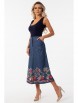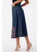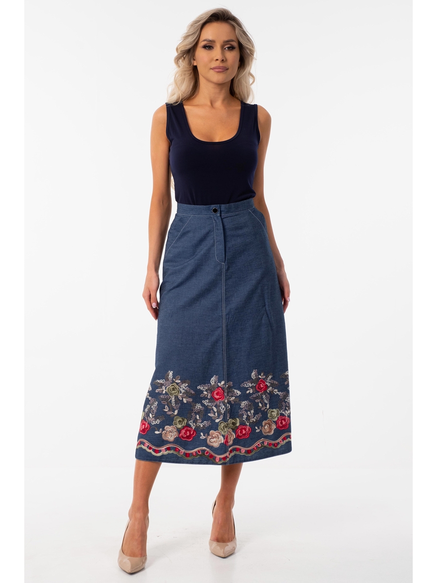 Женственная юбка полуприлегающего силуэта из текстильного полотна синего цвета. Верхняя часть изделия обработана поясом. По переду изделия выполнена застежка на молнию и пуговицу. Юбка дополнена боковыми карманами. По низу изделия выполнена вышивка. Длина изделия по спинке от пояса до низа изделия — см.