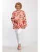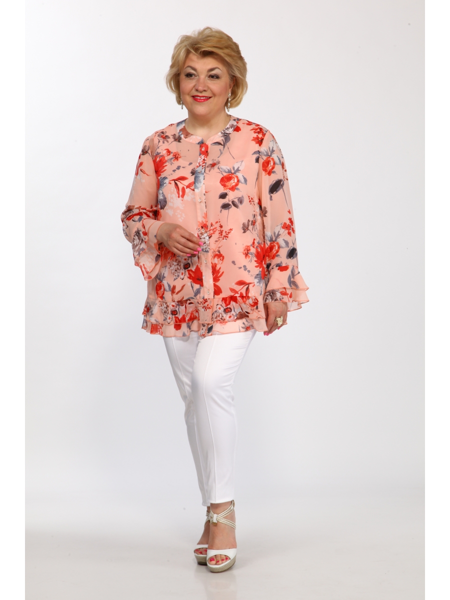 Блуза: Вырез горловины округлой формы, воротник стойка прилегающая к горловине. По переду центрально-бортовая застежка на 6 прорезных петель и пуговиц. Рукав втачной одношовный с притачными по низу воланами. По низу блузы притачные воланы.