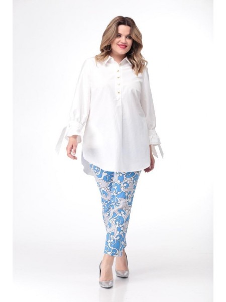 Блуза женская А-силуэта. Перед с нагрудными вытачками. По центру переда планка на 5 прорезных петель и пуговиц. Планка до талии. В низу планки заложена односторонняя складка. Спинка на кокетке. Нижняя часть спинки с легкой обработкой по спинке. Воротник на стойке отложной. Рукав втачной. Низ рукава присобран на хлястик. В боковых швах разрезы и действующие карманы.