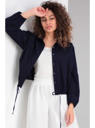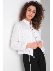 Блуза свободного силуэта, воротник рубашечного типа на стойке, рукав втачной на спущенной пройме со сборкой на эластичной ленте. Застежка петли, пуговицы. По низу полочки регулируемая кулиска.