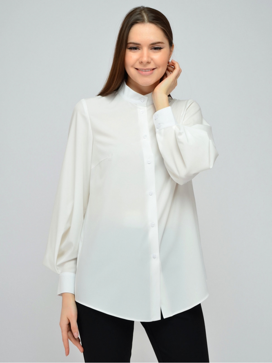 Блузка приталенного кроя с объёмными рукавами Приталенная блузка с объёмными рукавами - беспроигрышный вариант для весенней поры. Аккуратный воротник-стойка и длинные рукава на манжете с декоративной складкой составляют строгий и современный стиль. Ткань блузки лёгкая и воздушная, что придаёт образу утончённости и элегантности. Блузка с фигурным низом приятна к телу, её захочется надеть на самые разные мероприятия. В составе блузки полиэстер 95%, лайкра 5%. Отделка горловины - воротник-стойка, вырез горловины - округлый, рукав длинный, вид застёжки - пуговицы, декоративный элемент - складки на рукавах, крой приталенный, рукав втачной, рукав широкий на манжете с декоративной складкой, низ изделия фигурный. Рекомендована стирка при температуре не более 30С. С помощью летящей блузки с объёмными рукавами можно создать образ в стиле спортивный шик. Заправьте её в джинсы на высокой талии, наденьте туфли с острым носом на высоком или на низком ходу, и Вы будете неотразимы. А с юбкой карандаш или с классическими брюками Вы будете выглядеть строго и современно.