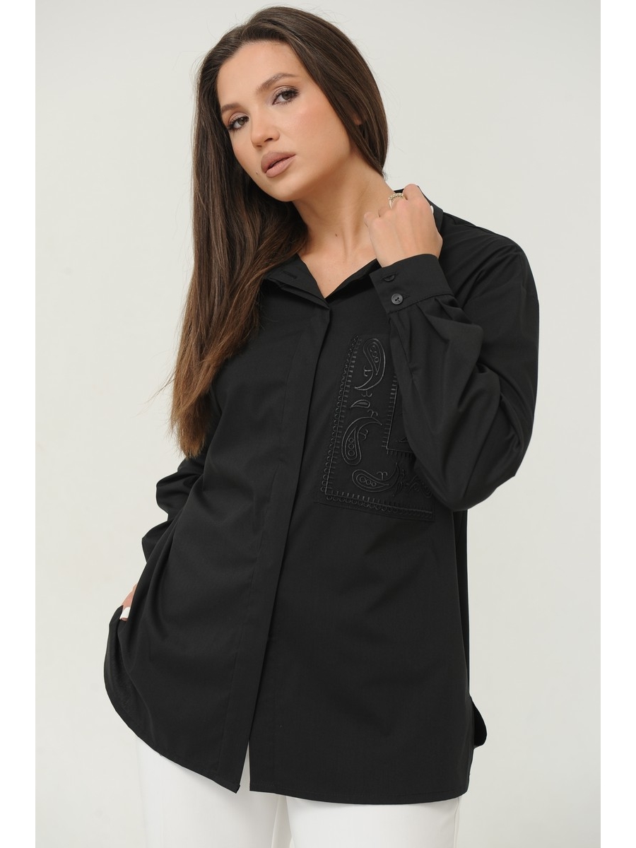 Хлопковая рубашка Ma Сhérie прямого силуэта с разрезами в боковых швах. Воротник отложной на стойке. Застежка центральная потайная на петли и пуговицы, спинка с кокеткой. Полочка с декоративным накладным карманом с вышивкой, спинка с кокеткой. Рукав длинный со спущеной линией плеча, одношовный с односторонними складками и притачной манжетой по низу.