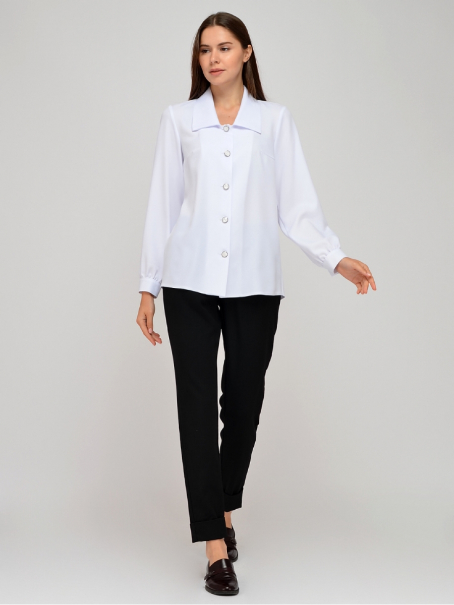 Прямая блузка с фигурным вырезом.Прямая блузка с фигурным вырезом - беспроигрышный вариант для современного офисного стиля. Аккуратный отложной воротник и длинные рукава составляют строгий деликатный образ. Ткань блузки лёгкая и воздушная, что придаёт образу утончённости и элегантности. Классическая блузка на пуговицах стильно будет смотреться при любых обстоятельствах.Вырез - фигурный. Отделка горловины - воротник. Воротник отложной. Рукав длинный. Рукава втачные. Вид застёжки - пуговицы. Декоративный элемент - пуговицы. Крой прямой. Рекомендована стирка при температуре не более 30С.Дополнив блузку жакетом, юбкой карандаш или классическими брюками, Вы создадите строгий деловой образ. С помощью прямой блузки с фигурным вырезом также можно создать стильный городской образ. Заправьте её в джинсы на высокой талии, наденьте туфли с острым носом на высоком или на низком ходу.