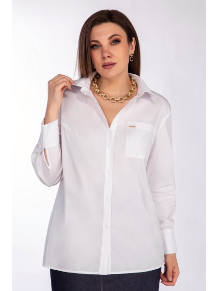 Классическая блуза прямого силуэта, из хлопковой ткани. Воротник рубашечного типа на притачной стойке, по переду центральная застежка на петли пуговицы. Линия плеча слегка приспущена, рукав втачной длинный, по низу заложены мягкие складки, притачной манжет с застежкой на две петли-пуговицы. На левой полочке расположен накладной карман с декоративной отделкой. Спинка без конструктивных элементов.