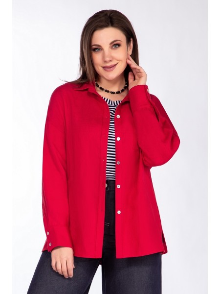 Рубашка женская, прямого силуэта, со спущенной линией плеча. Горловина оформлена рубашечным воротником с отрезной стойкой, по переду расположен карман с термопечатью. Рукава втачные, низ рукава обработан манжетой с застежкой на петли-пуговицы. В боковых швах разрезы. Яркий акцент для летнего гардероба.