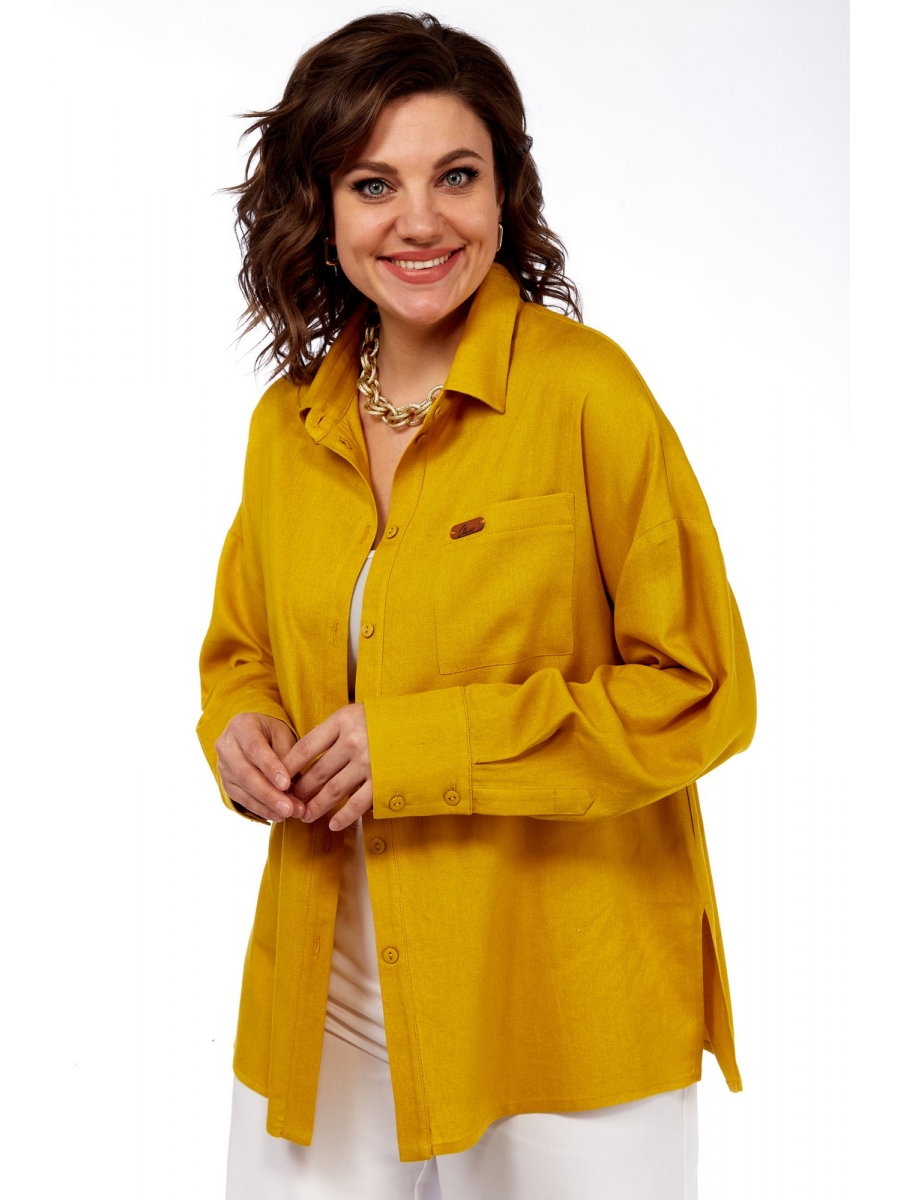 Рубашка женская, прямого силуэта, со спущенной линией плеча, изготовленного из ткани лен с добавлением вискозы. Горловина оформлена рубашечным воротником с отрезной стойкой, по переду расположен карман. Рукава втачные, низ рукава обработан манжетой с застежкой на петли-пуговицы. В боковых швах разрезы. Яркий акцент для летнего гардероба.