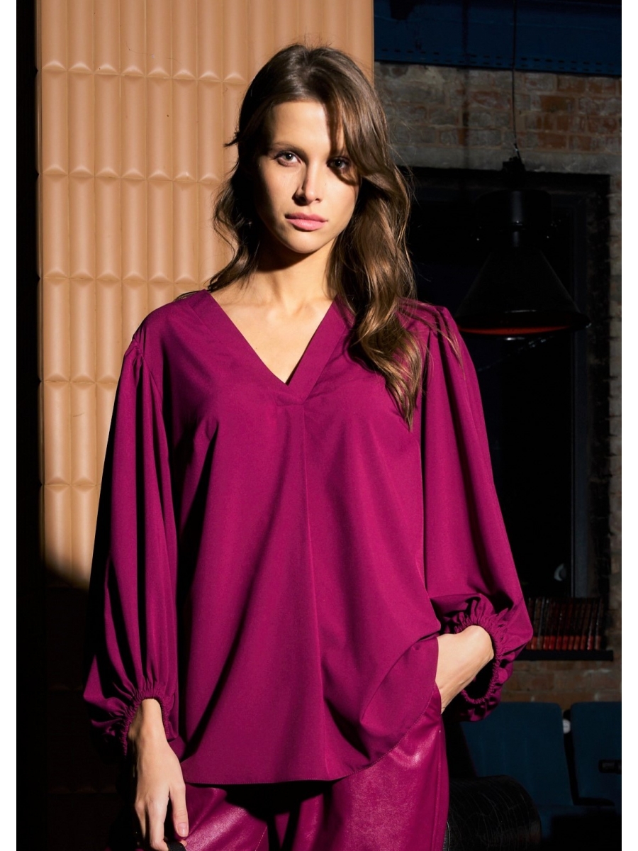 Оформить заказ →Блуза женская, полуприлегающего силуэта. По полочке идет нагрудная выточка из бокового шва. Вырез V-образной формы с планками и складкой по центру. По спинке средний шов, рукав объёмный, по окату сборка. Низ рукава фигурный, на резинке.