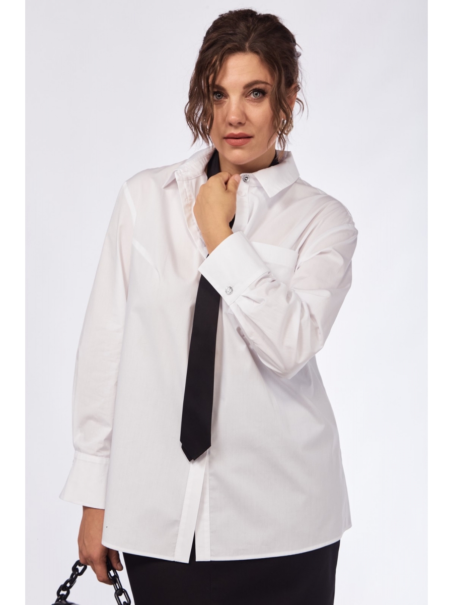 Блуза прямого силуэта, из хлопковой ткани. Воротник рубашечного типа на притачной стойке, по переду центральная застежка на петли пуговицы. Линия плеча слегка приспущена, рукав втачной длинный, по низу заложены мягкие складки, притачной манжет с застежкой на одну петли-пуговицы. На левой полочке расположен накладной карман. На стойке воротника и манжетах – застежка на декоративную пуговицу. Спинка без конструктивных элементов.