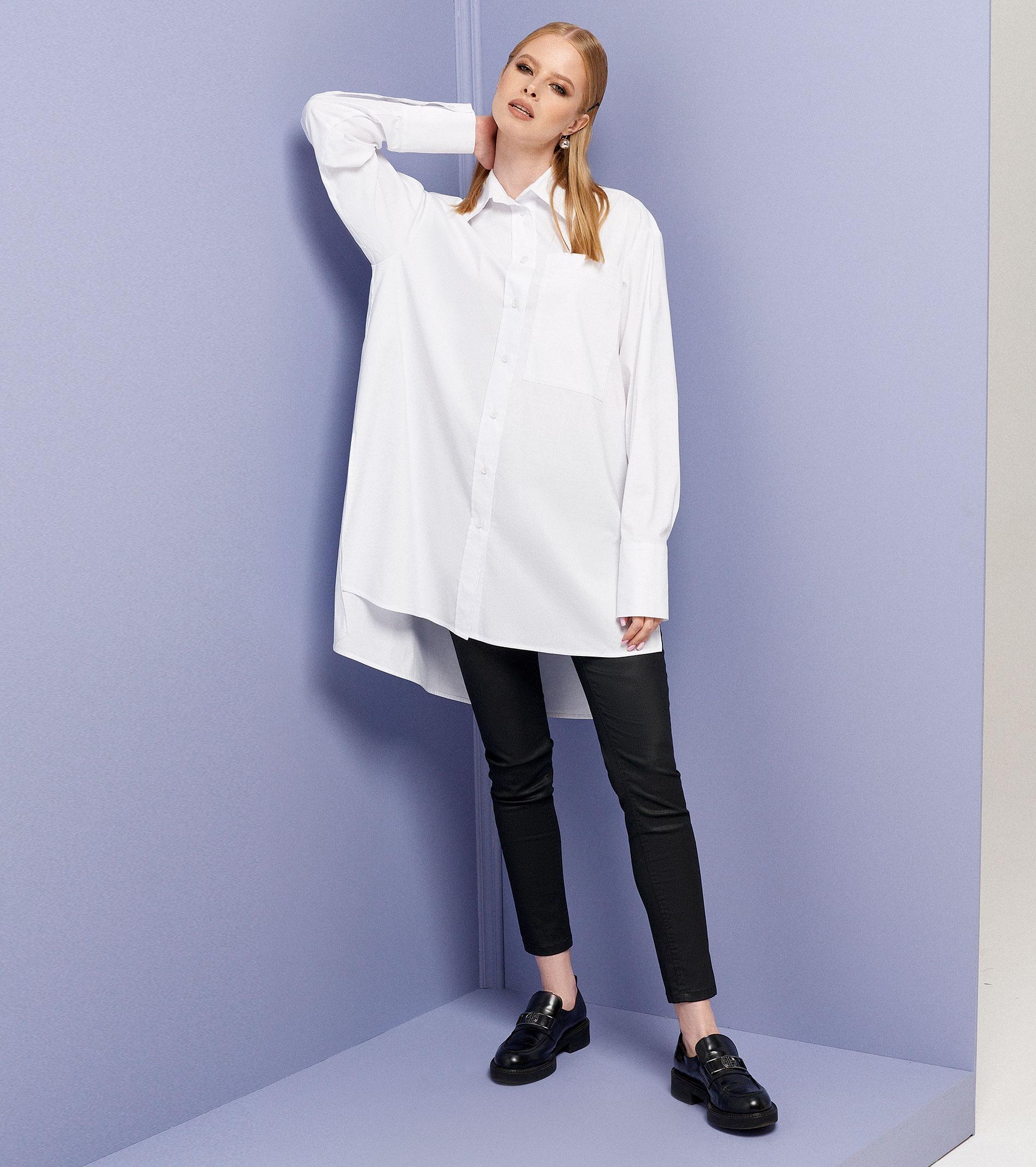 Блузка длинная женская с ассиметричная низом выполнена в стиле оверсайз. Свободный крой дарит свободу и позволяет создавать модные образы. Блузка с длинным рукавом отлично дополнит гардероб. Перед короче спинки.Ее можно носить под джинсы, брюки, лосины, сверху надевать безрукавку, пиджак, куртку. Хлопковая блузка отлично пропускает воздух к телу, не парит, даже в теплую погоду вы будете ощущать комфорт. В ней можно отправиться на прогулку, встречу с друзьями, учебу, в офис. Закажите блузку рубашку женскую из хлопка в размерах 42-50 по выгодной цене.