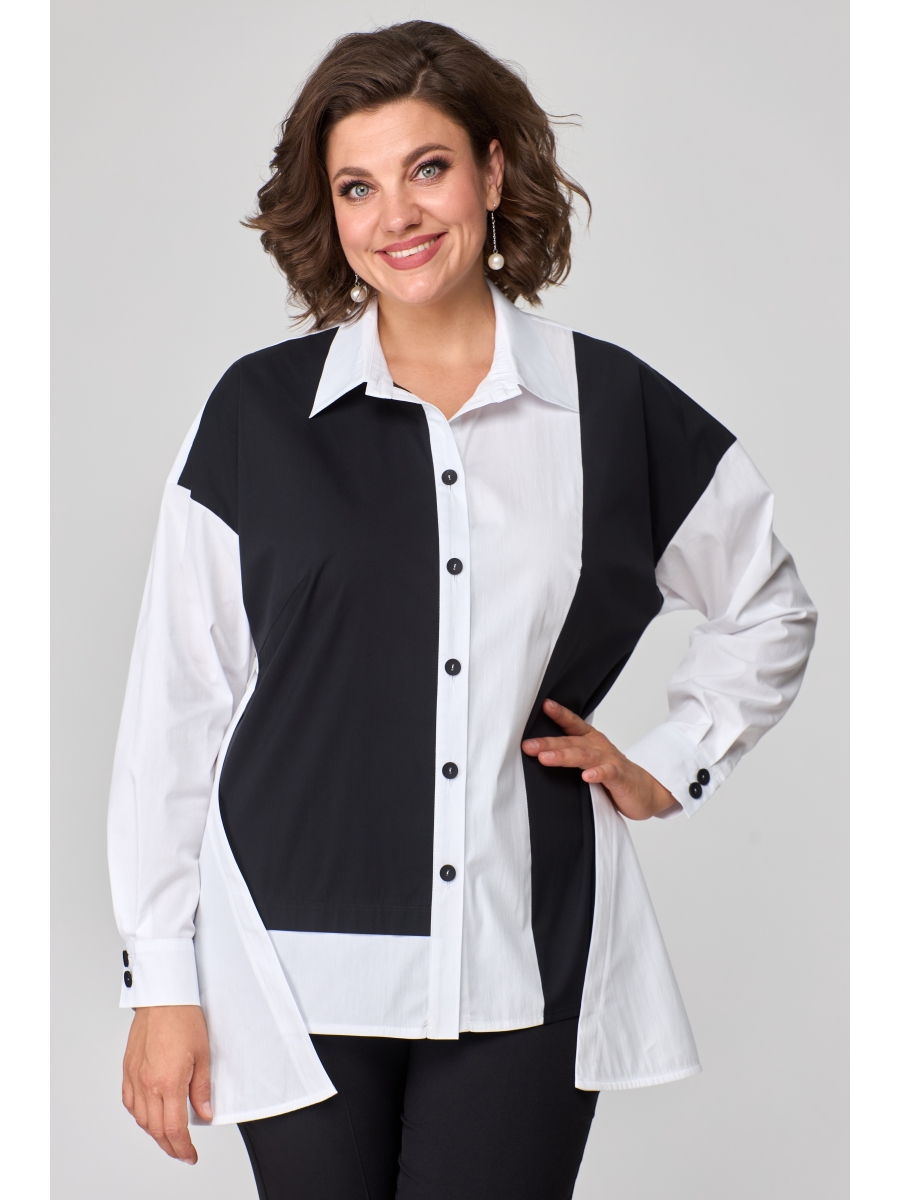 Блузка прямого, свободного силуэта выполнена из однотонной рубашечной ткани в двух контрастных цветах. Полочка блузки с центральной застежкой в виде притачной планки на петли и пуговицы. Полочка блузки в центральной части ассиметрична. Горловина круглой формы, обработана воротником рубашечного типа. Спинка с отрезной плечевой кокеткой и складкой по центру спинки. Пройма углубленной формы, рукав рубашечного типа, одношовный. Рукав по низу со складками и на притачной манжете с застежкой на петли и пуговицы.
