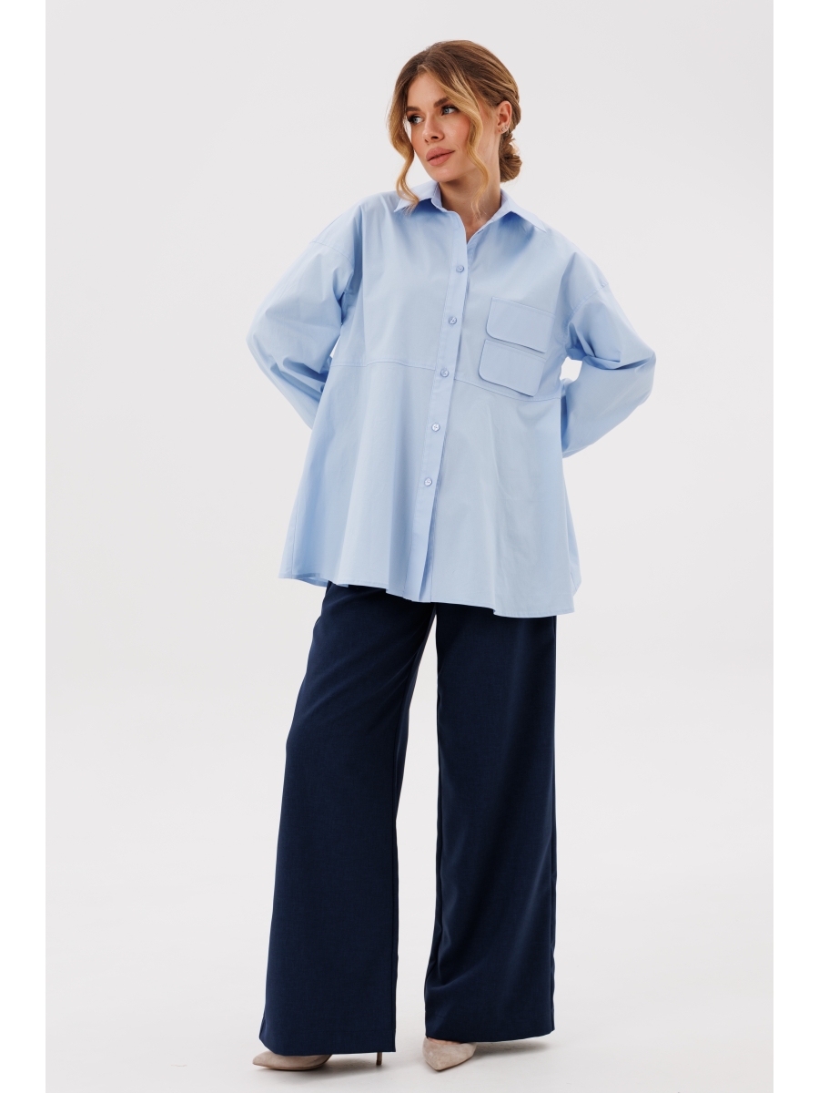 Рубашка женская А-силуэта отрезная по линии талии. По переду слева декоративные клапаны. Рукав длинный на манжете. Низ фигурный.