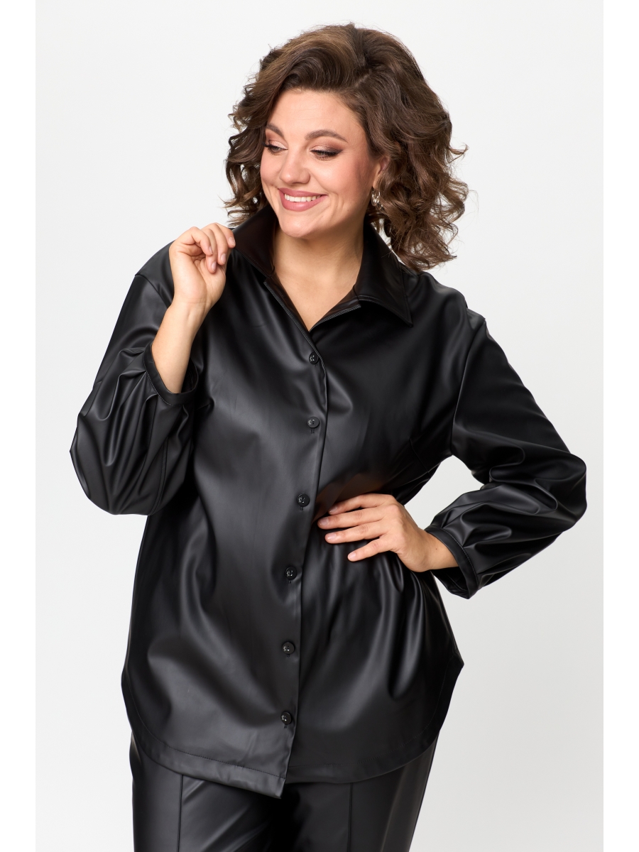 Рубашка прямого силуэта, выполнена из экокожи. Полочка рубашки с нагрудными вытачками и центральной застежкой на петли и пуговицы. Воротник рубашечного типа стояче-отложной. Спинка цельная. Низ блузки фигурный. Пройма углубленной формы, рукав рубашечного типа, с декоративными швами. По низу рукава обработаны встречные складки и притачная планка.