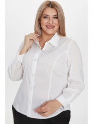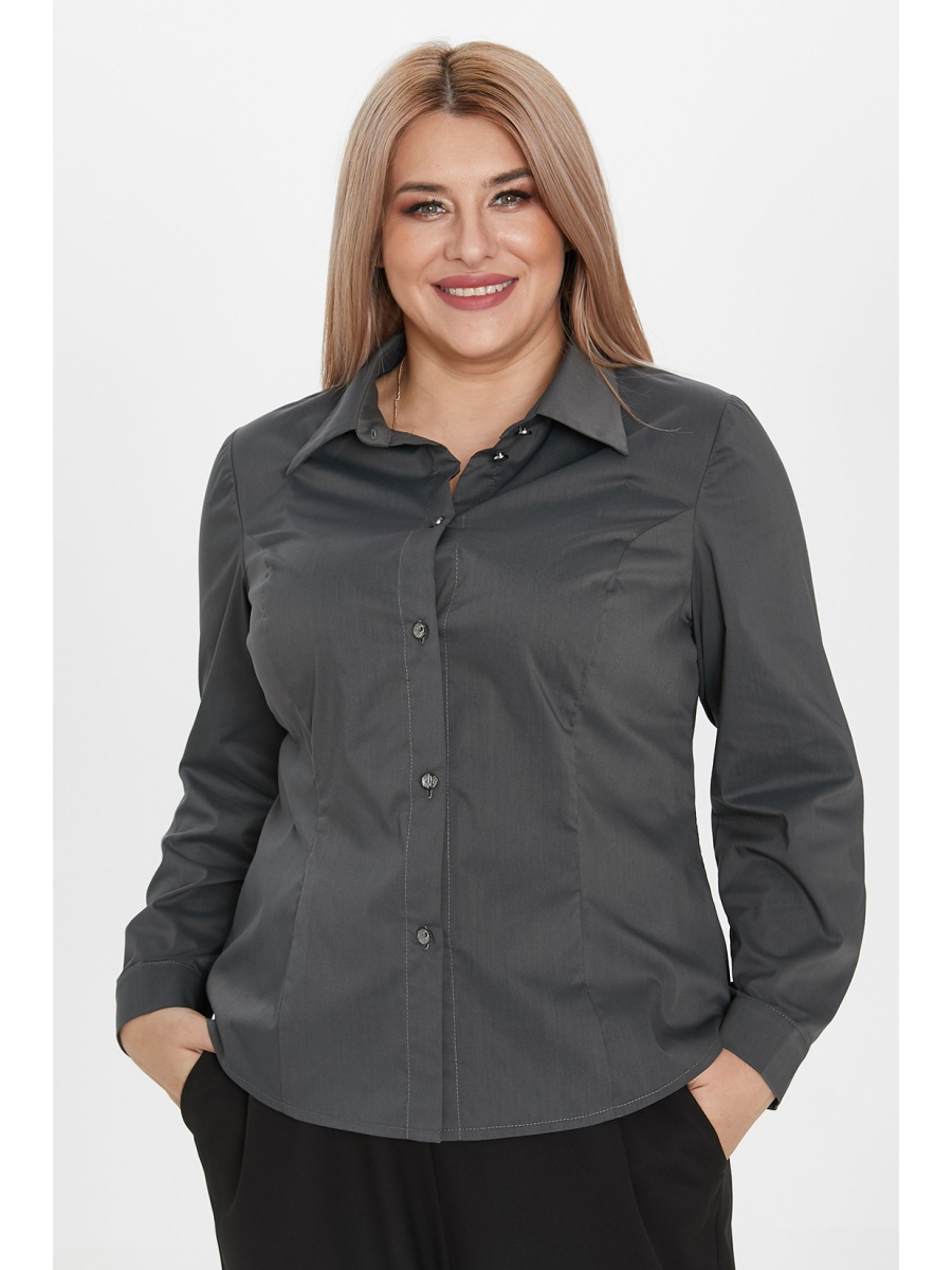Блузка полуприлегающего силуэта из сорочечной ткани, длиной до линии бедра. Прилегание по фигуре достигнуто за счет рельефов переда и спинки. Горловина оформлена отложным воротником на притачной стойке. Перед с центральной застежкой на петли и пуговицы. Втачные длинные рукава по низу дополнены манжетами с застежкой на петли и пуговицы. Низ фигурный.