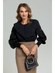 Блузка женская из лёгкой хлопковой ткани, прямого силуэта. Оригинальна в исполнении с художественной вышивкой по рукавам. По центру переда планка на 11 петель и столько же пуговиц. Рукав реглан, по низу рукава манжета присборена на эластичную тесьму (венгерку) для фиксации. Горловина округлой формы, по горловине изделия декоративные защипы.
