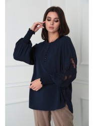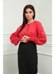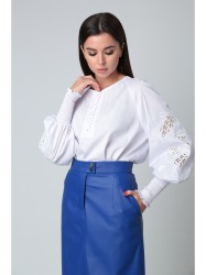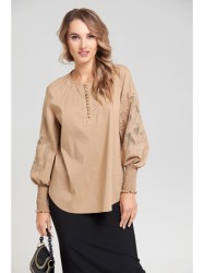 Блузка женская из лёгкой хлопковой ткани, прямого силуэта. Оригинальна в исполнении с художественной вышивкой по рукавам. По центру переда планка на 11 петель и столько же пуговиц. Рукав реглан, по низу рукава манжета присборена на эластичную тесьму (венгерку) для фиксации. Горловина округлой формы, по горловине изделия декоративные защипы.