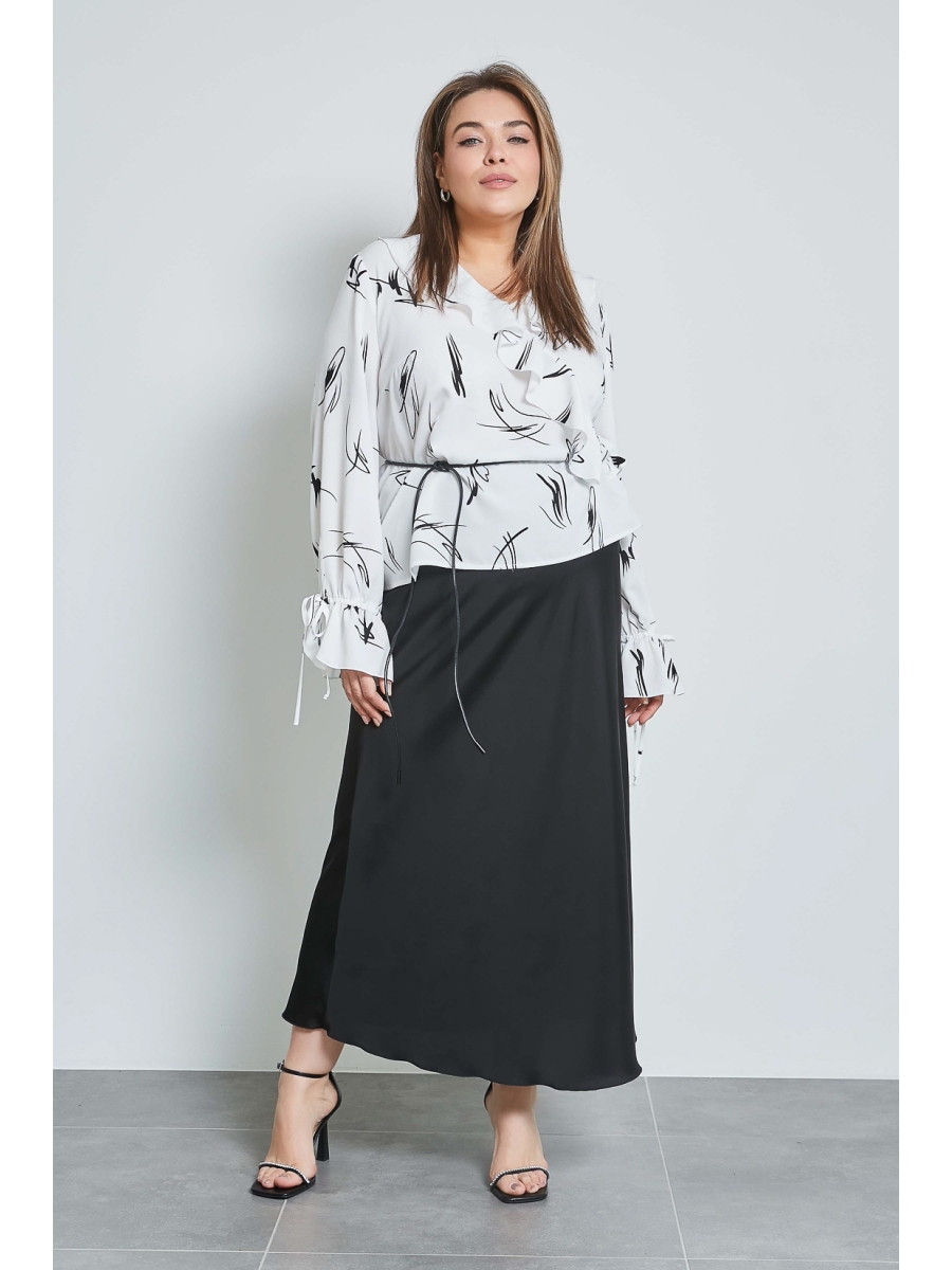 Женственная блуза выполнена  из шелковой ткани. По переду прилегание по груди за счет вытачек. V образный вырез горловины дополнен воланом плавно опускающимся к низу. Втачные длинные рукава дополнены оборкой о мягкой завязкой на запястье, оборка как и волан горловины обработан закруткой.Блузка позволит вам выглядеть стильно и женственно в любой ситуации. Она идеально подходит как для торжественных мероприятий, так и для повседневной носки. Блузка больших размеров обеспечит комфорт и уют в любое время года.