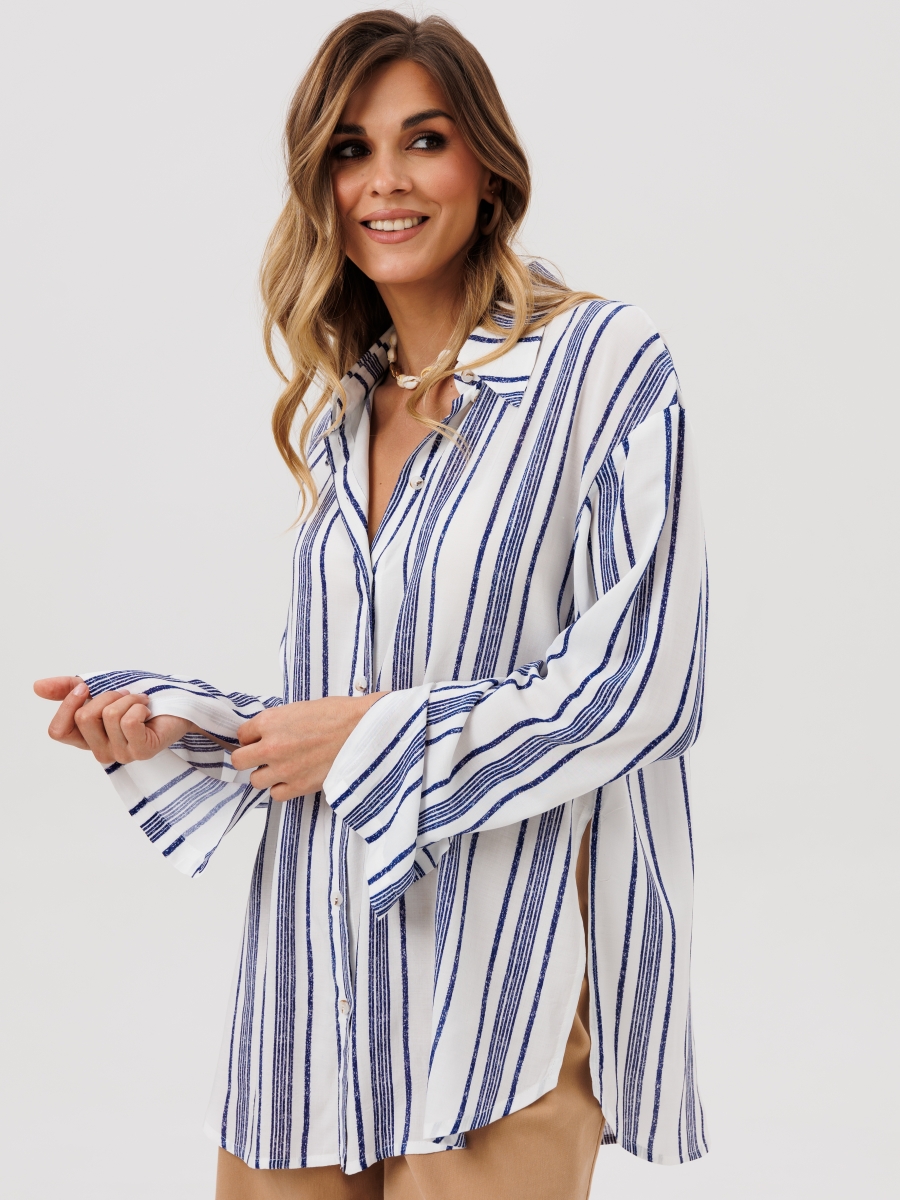 Рубашка свободного силуэта из легкой вискозной ткани. Застежка центральная на петли и пуговицы, воротник на стойке. В боковых швах разрезы. Рукав втачной рубашечного кроя по низу с разрезом.