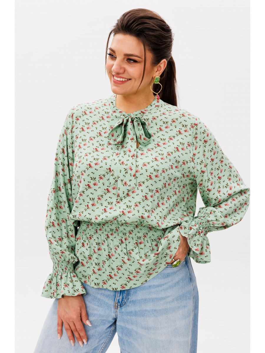 Свежий оттенок «мелисса» и лёгкая вискозная ткань с изысканным принтом создают воздушный образ, наполненный весенним настроением. Мягкие складки материала струятся по фигуре, подчеркивая изящество силуэта.