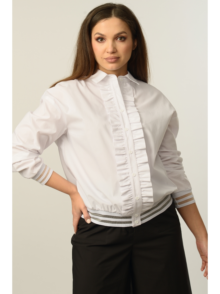 Блуза женская,прямого силуэта с центральной застёжкой-планкой на петли и пуговицы. Линия плеча спущенная, рукав втачной одношовный с притачным манжетом по низу(довяз). По переду в шов притачивания планки вставлена рюша из основной ткани. По спинке кокетка, по шву притачивания кокетки заложена встречная складка. По низу изделия притачной манжет(довяз). Воротник стояче-отложной с отрезной стойкой.