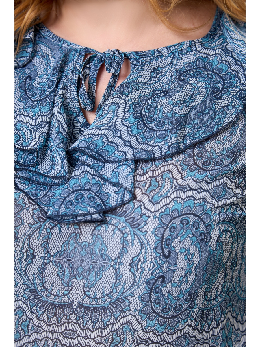 Блуза прямого силуэта, длиной до середины бедра. Рукав втачной, длинный, низ со сборкой, на узкой манжете. По переду капля и фиксируется бантом, горловина декорирована рюшей. Отличный офисный вариант и актуальная цветовая гамма на выбор.