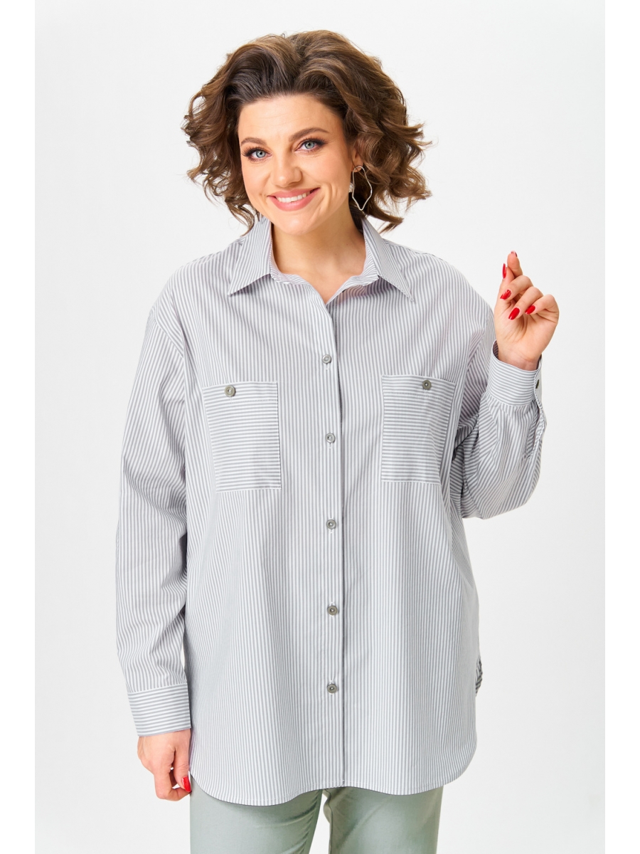Блузка женская свободного силуэта выполнена из легкой хлопковой ткани. Горловина с отложным воротником на стойке. Застежка центральная на петли и пуговицы. Спереди в верхней части накладные карманы. Спинка с кокеткой и складкой из-под кокетки. Плечо спущенное, линия поймы углубленная. Рукава длинные на манжете, с застежкой на петлю и пуговицу. Линия низа блузки фигурная.
