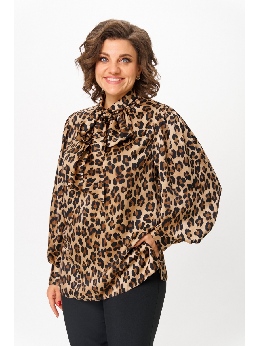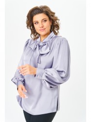 Блузка женская полуприлегающего силуэта, с втачным рукавом. Горловина v-образная со сборкой и воротником - хомут переходящим в бант. Рукав длинный, присборенный по окату и низу рукава, на манжете с застежкой на петли и пуговицы. В боковых швах обработаны разрезы.