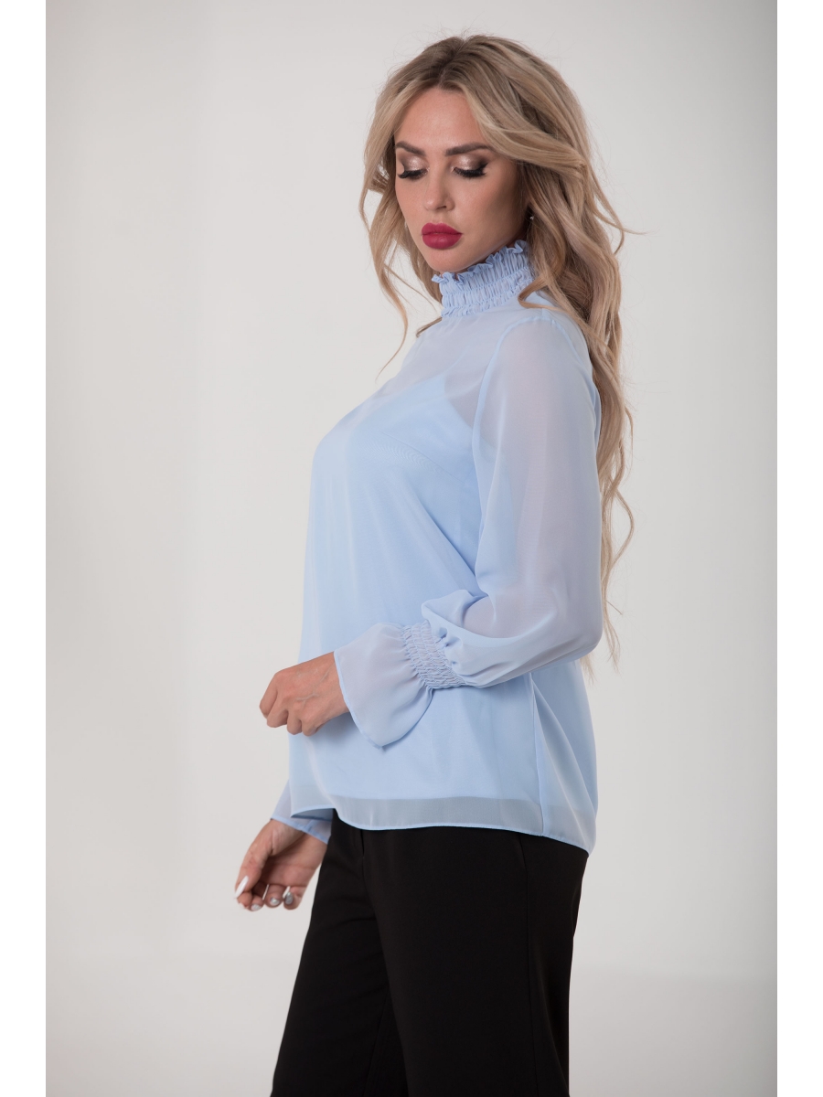 Блузка с застежкой на навесные петли и пуговицы по стойке спинки. Отрезная стойка присборена венгеркой. Спинка цельная, с разрезом- капелькой по горловине. Манжета рукава присборена венгеркой.