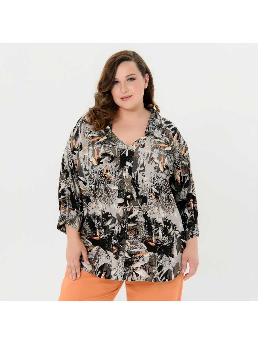 Свободная рубашка из штапеля. Линия плеча спущена, низ рукава присборен, заканчивается манжетом. По центру переда планка, плавно переходящая в вырез, в который втачан рубашечный воротник.