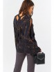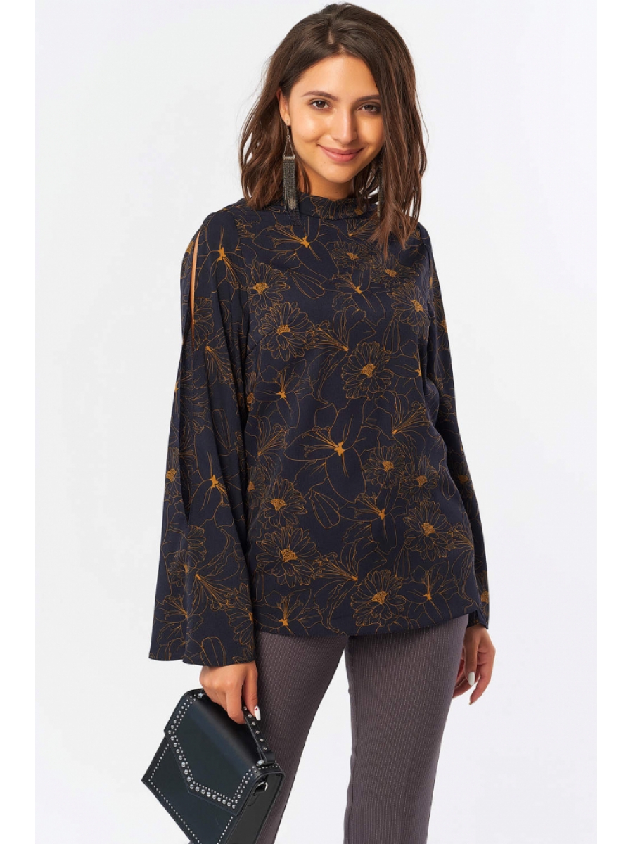 • Особенности: Блузка прямого силуэта из блузочной ткани. Детали: расклешеный рукав с щелью по среднему шву, V-образный вырез горловины по спинке, воротник-стойка переходящий в завязки. Без застежки.
