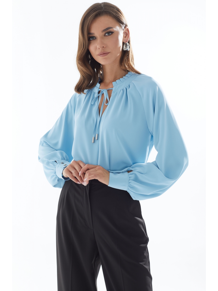 Блузка прямого силуэта. Воротник - стойка, декорирован изящными складками, по переду с V-образным вырезом и завязками. По переду блузки центральным шов, декорированный пуговицами. Рукав реглан длинный, на манжете с застежкой на петли и пуговицы. Длина блузки: 64см. Длина рукава: 52см от горловины