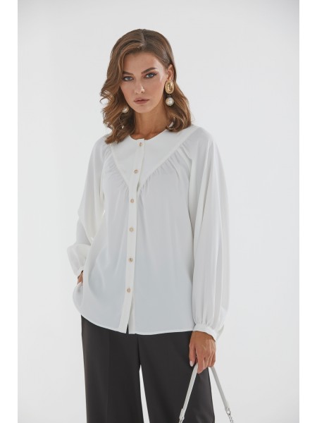 Блузка прямого силуэта из струящейся ткани. Горловина округлая по центру планка с застежкой на петли и пуговицы. По переду и спинке кокетка фигурной формы, от кокетки сборка. Рукав "реглан" длинный, на манжете с застежкой на петли и пуговицы.