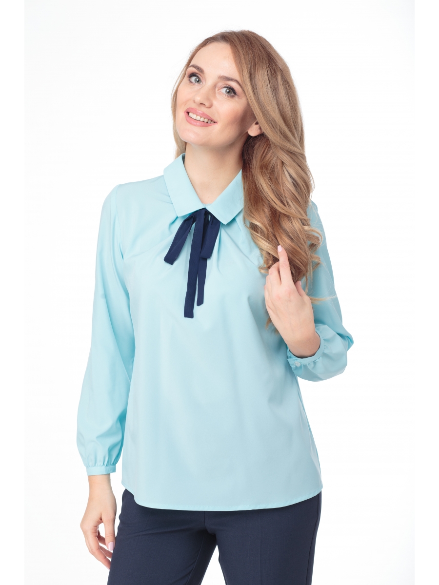 Блузка свободного кроя. Скругленный воротник-стойка, декорирован тесьмой-бантом темно-синего цвета во всех цветах блузки. Застежка на пуговицы по спинке блузки. Декор - продолжение пуговиц по спинке, имитация фальшь-застежки. С длинным рукавом.