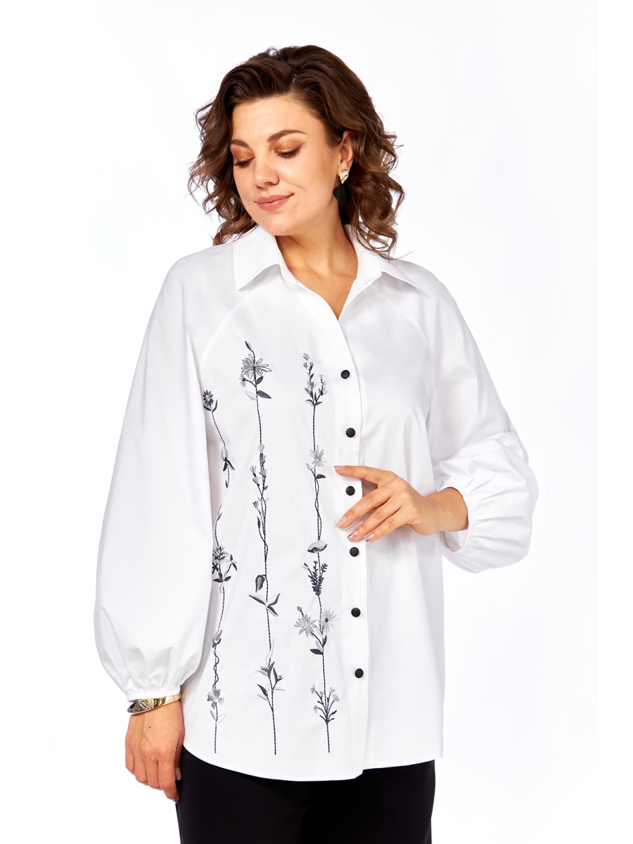 Блузка женская свободного кроя из рубашечной ткани. Воротник стояче-отложной, застежка на петли и пуговицы. По полочке дизайнерская вышивка. На спинке обработана встречная складка. Рукава-реглан, со сборкой на резинку по низу. Низ блузки фигурной формы.