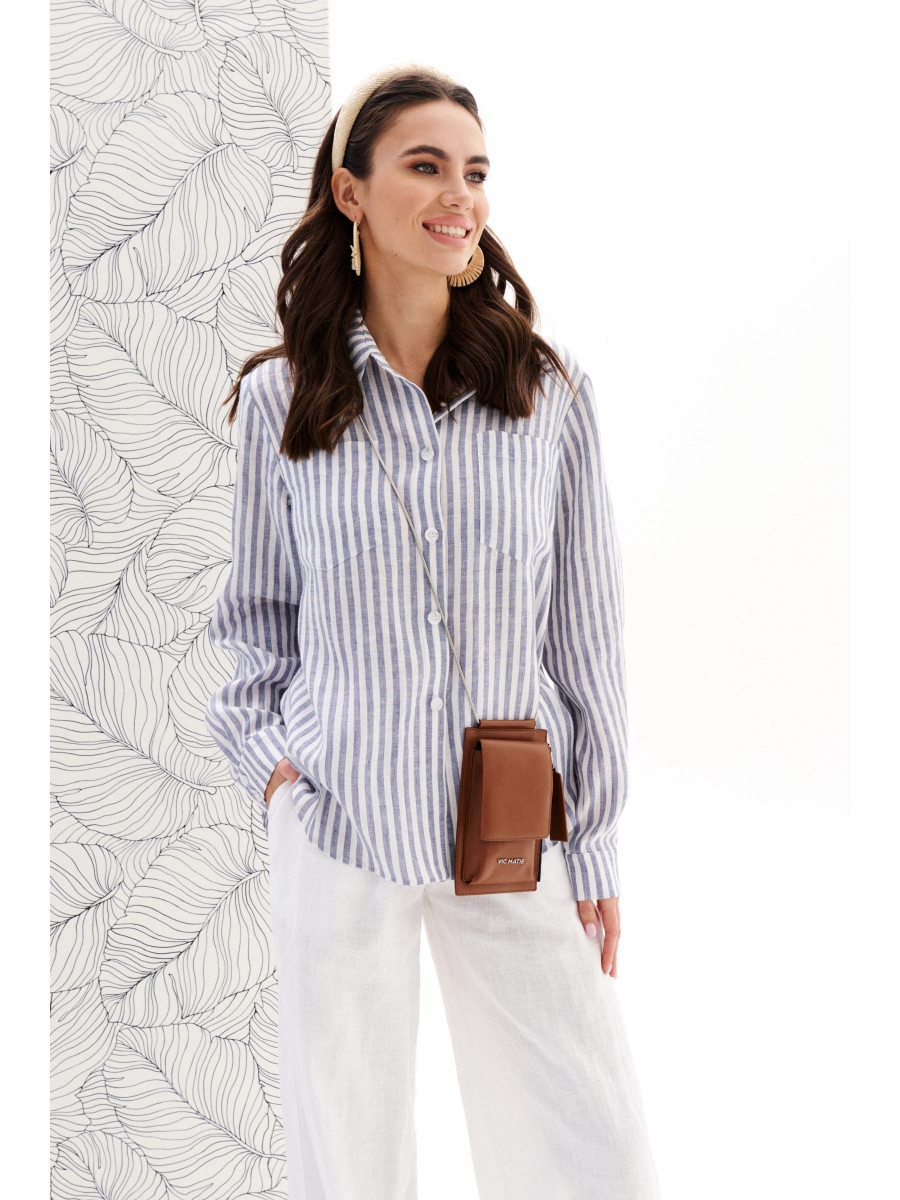 Блузка женская, свободного силуэта, длиной до середины линии бедер из плательно-блузочной ткани. Перед с нагрудными вытачками, накладными карманами, цельнокроеной планкой и застежкой на петли, пуговицы. Спинка с отрезной двойной кокеткой и декоративной косой, глубокой складкой. Рукав одношовный, втачной, длинный, со складками по низу, на притачной манжете с застежкой на петли, пуговицы. Воротник рубашечный с отрезной стойкой. Низ блузки фигурный.