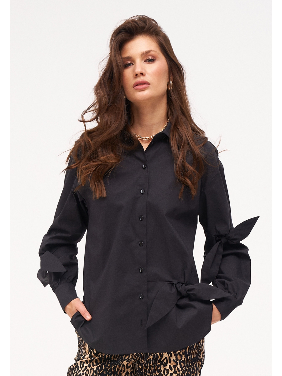 Рубашка свободного силуэта со спущенной линией плеча, классическим воротником на стойке и с застёжкой на планку с пуговицами. По переду и рукавам декоративные элементы в виде завязок. Спинка слегка длиннее переда. По бокам разрезы.