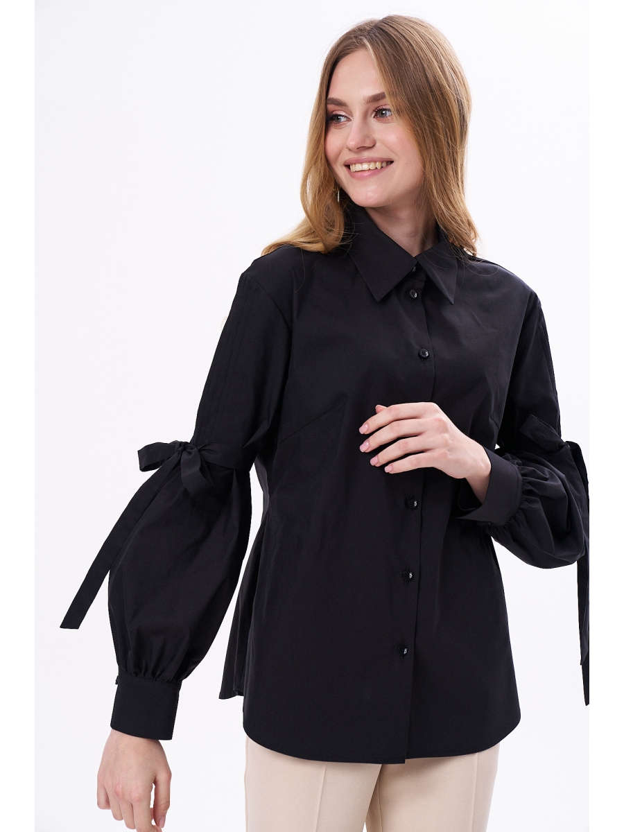 Хлопковая рубашка с акцентом на рукава. Верхняя часть рукава с защипами плавно переходит в объёмный низ со сборкой на манжете. Слегка выше локтя декоративная завязка на бант. Воротник классической формы. По переду нагрудные вытачки. Застёжка на пуговицы.