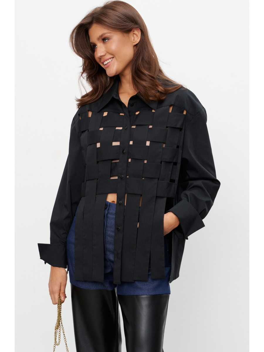 Хлопковая рубашка с дизайнерским решением по переду в виде переплетённых обтачных деталей. Линия плеча спущена, рукав с длинной манжетой, которую можно складывать пополам. Застёжка на планку с пуговицами спереди.
