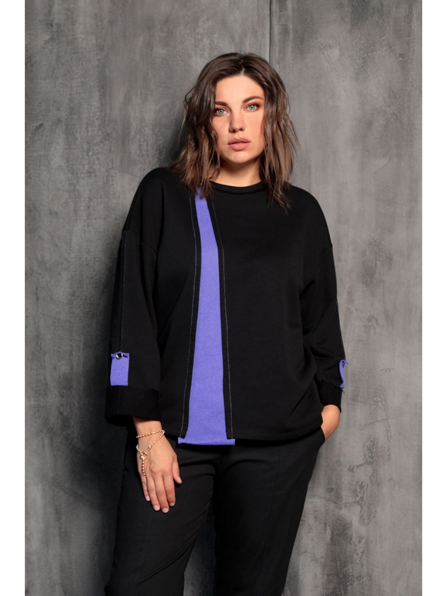 Стильный, удобный, практичный свитшот. Выполнен из мягкой трикотажной ткани трёхнитки, в составе которой 65% хлопка. Горловина декорирована золотистой пряжкой. Отличительной чертой этого свитшота является слегка спущенная линия плеча и расклешённый рукав. Длина 5/8, подогнут изнаночной стороной наружу и декорирован патой с золотой пуговицей. Цветная вставка вытягивает силуэт и создаёт выгодный акцент на Вашей фигуре.